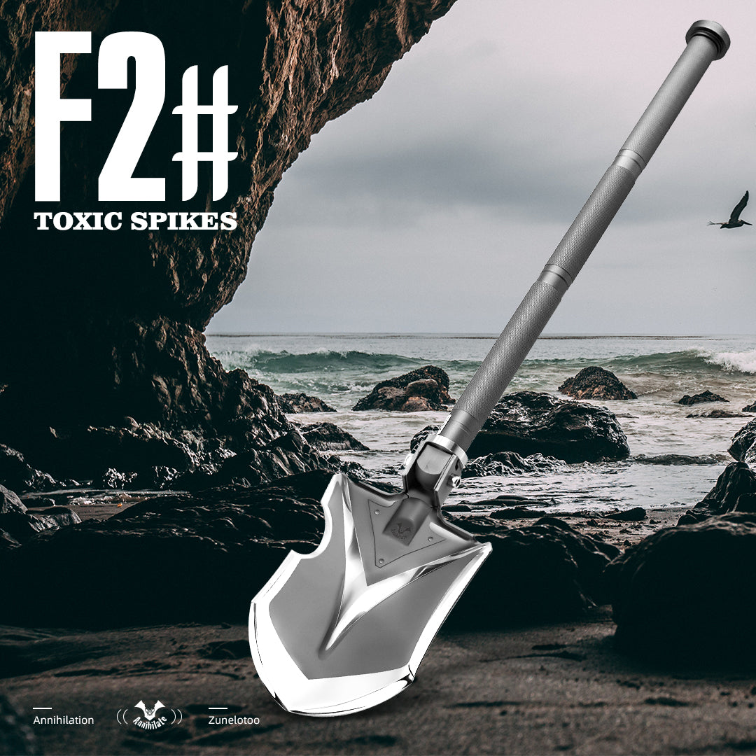 Zune Lotoo annihilate F2 multifunctional shovel is made of high-carbon steel, under 20 procedures, which shovel face adopts die-casting technology. The handle is designed as tacked diamond-shapes knurled, which can bear an 80kg man standing on it.